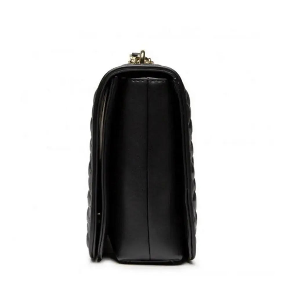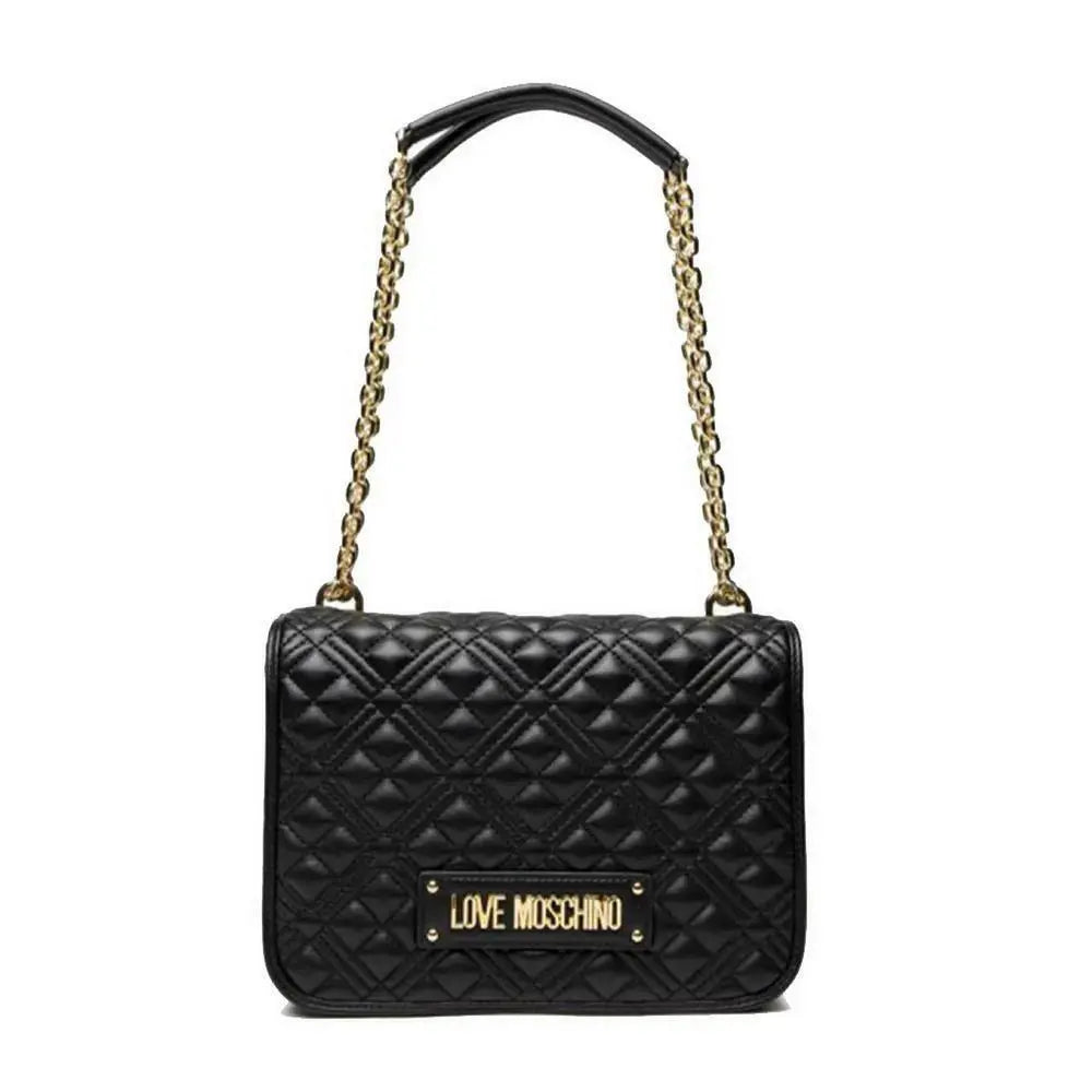 أنيق وأنيق حقيبة كروس مبطنة من لوف موسكينو، مصمم من الجلد الصناعي الأسود الفاخر بنمط مبطن بالألماس. يتميز باللون الذهبي أحب موسكينو لوحة على الجهة الأمامية وحزام كتف أنيق من السلسلة والجلد. صغير الحجم ولكنه عملي، مثالي للتصفيف من النهار إلى الليل.