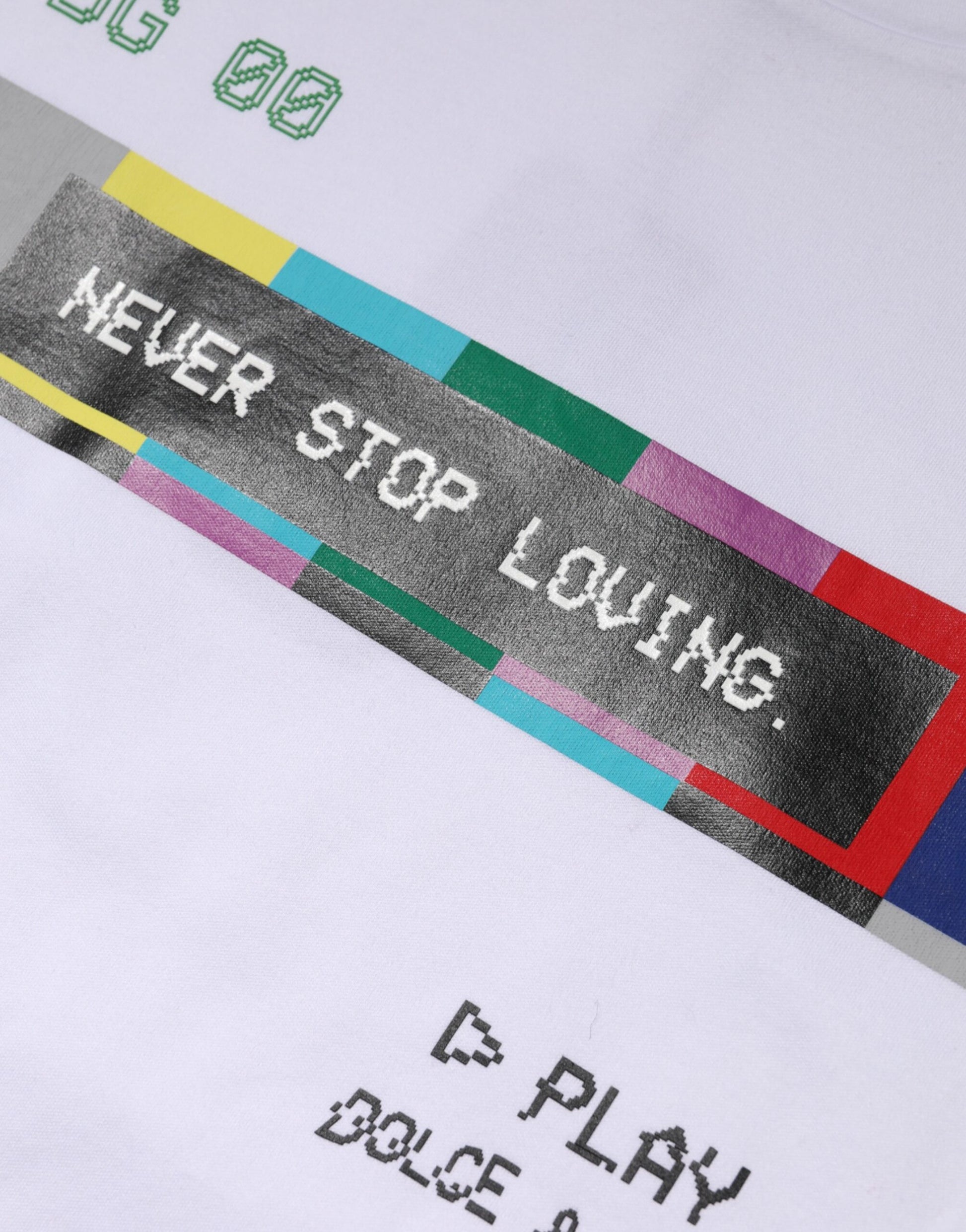 تي شيرت Dolce & Gabbana رائع جديد تمامًا، أصلي بنسبة 100%، برقبة دائرية مصنوع من القطن مع طباعة شعار NEVER SROP LOVING PLAY DG.