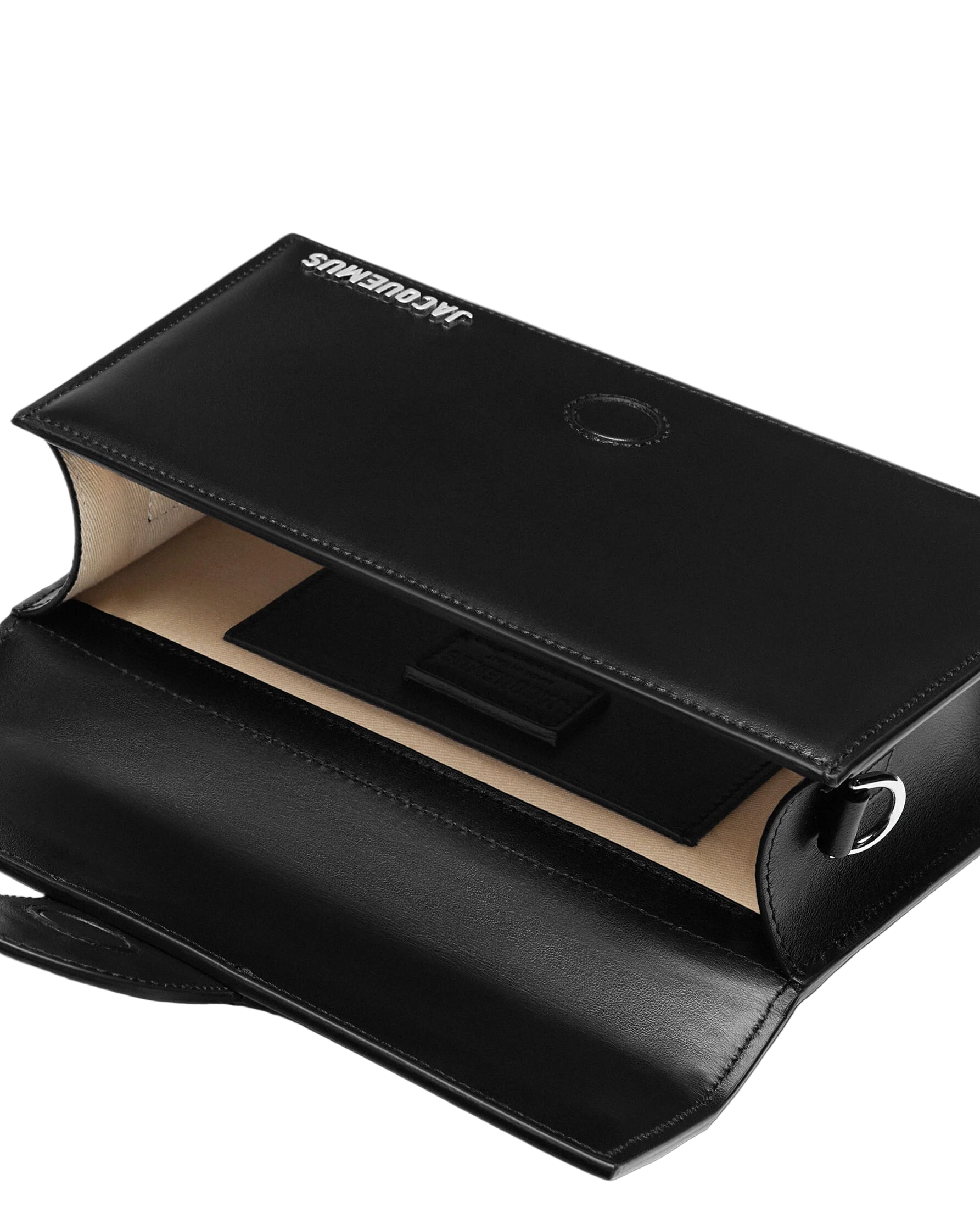 A sleek and modern Jacquemus Le Bambino Long Bag in classic black leather, designed with the brand’s iconic elongated silhouette. Crafted from smooth premium leather, it features a structured top handle, a flap closure with extended tab detail, and a detachable crossbody strap for versatile styling. Finished with the signature JACQUEMUS logo in silver for a minimalist luxury touch.